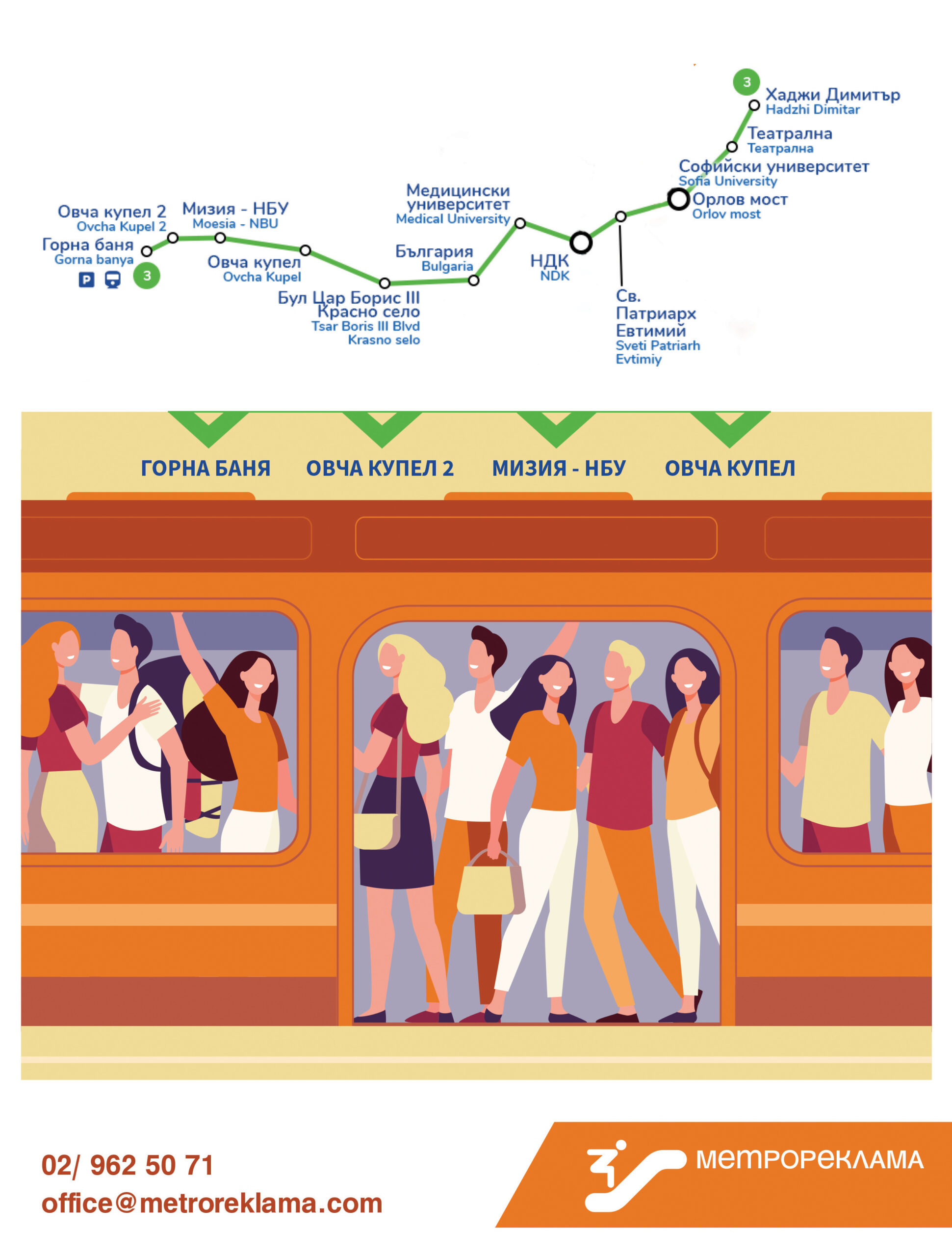 On 24.04.2021, the new section of line 3 of the Sofia Metro was opened. The section is 4 km long and includes the following metro stations – Gorna Banya, Ovcha Kupel 2, Mizia – NBU and Ovcha Kupel. The familiar advertising media METROPANA and ADVERTISING FRAMEWORKS are waiting for you!